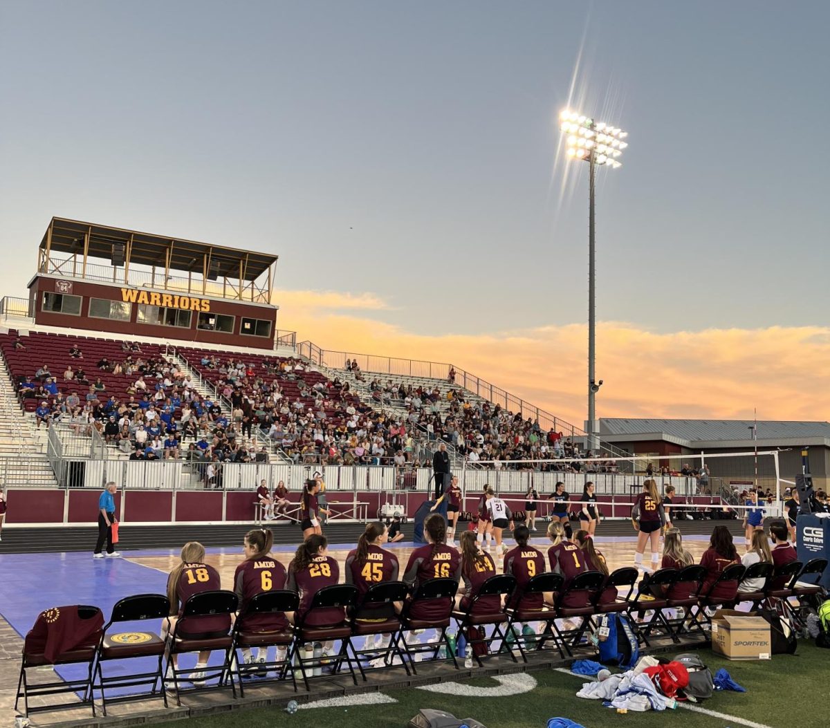Despite challenges from wind, lightning, and slippery conditions caused by evening dew, the Warriors adapted and closed out the final set inside The Dome for a 3-1 victory. “We’ve never played in anything like that,” said junior setter Ava Thompson. “We had to focus on keeping our cool and adjusting to whatever happened next.”
